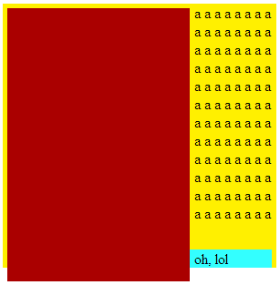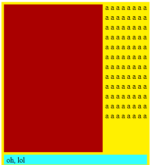 Rasks Skrevet 19. mars 2008 Skrevet 19. mars 2008 Jeg vet ikke om dette er den aller beste måten å gjøre det på. <html> <head> <style type="text/css"> .holder{ background-color: #FFF000; width: 300px;} .fatty{ background-color: #AA0000; margin: 5px; float:left; width: 200px; height: 300px;} .bottombar{ float:left; margin: 30px 5px 5px 5px; background-color: #33FFFF;} .clear { clear:both; } </style> </head> <body> <div class="holder"> <div class="fatty"> </div> a a a a a a a a a a a a a a a a a a a a a a a a a a a a a a a a a a a a a a a a a a a a a a a a a a a a a a a a a a a a a a a a a a a a a a a a a a a a a a a a a a a a a a a a a a a a a a a a <div class="clear"></div> <div class="bottombar"> oh, lol </div> </div> </body> </html>