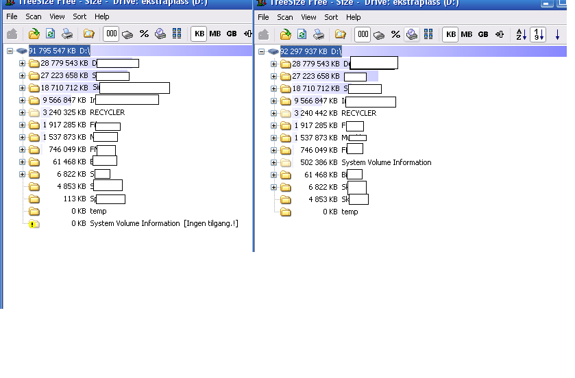 CrazyTeddy Skrevet 31. mars 2008 Forfatter Skrevet 31. mars 2008 beklager, dumt sakt av meg. Vedig glad for at du hjelper så mye! Hvis du ser på vedlegger ser du hva jeg har snakket om, selve plassen på D øker, mens mappene øker ikke. har valgt å sensurere navn, for begynner å bli privat. Sammenligning_D.bmp