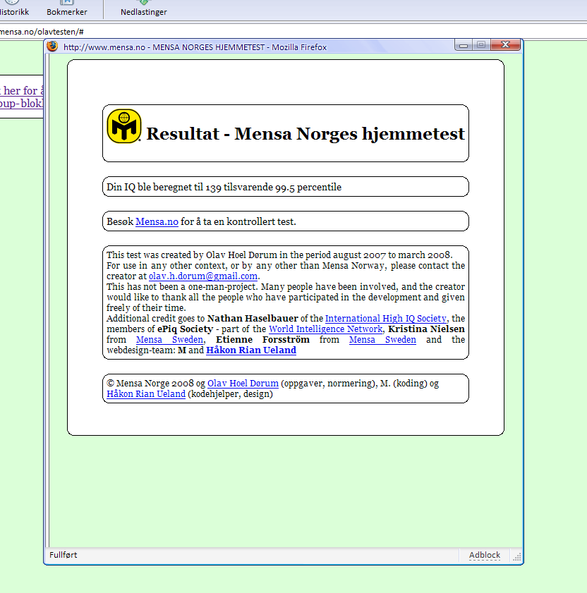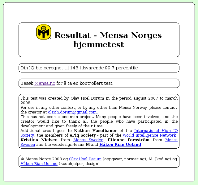 ZealD Skrevet 24. april 2008 Skrevet 24. april 2008 (endret) Hva får du til svar da? Jeg fikk 131 i IQ / 98 percentile. Hva mener de med det? 98% riktig? Endret 24. april 2008 av Phannyboy