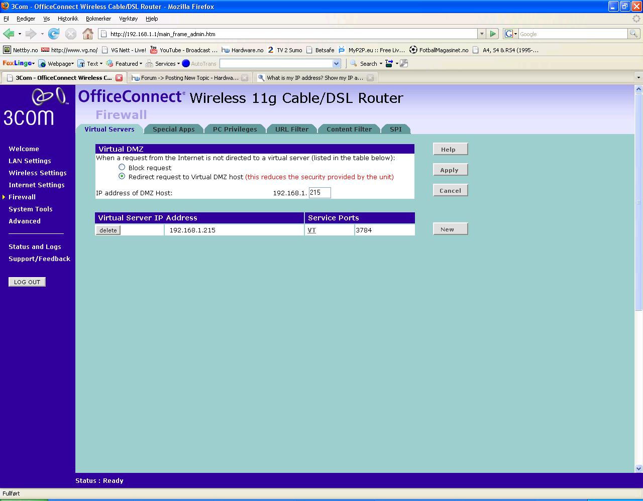 murdoc Skrevet 29. april 2008 Skrevet 29. april 2008 prøver og få satt opp rutern min, slik at jeg kan lage ventrilo server gjennom min ruter. problemet er at det ikke fungerer ;S har satt DMZ til det min lokale IP er, men det fungerer enda ikke :S har en: 3com - 3CRWE554G72T hva tror dere kan være galt :S ikke gjort dette før.. bilde: