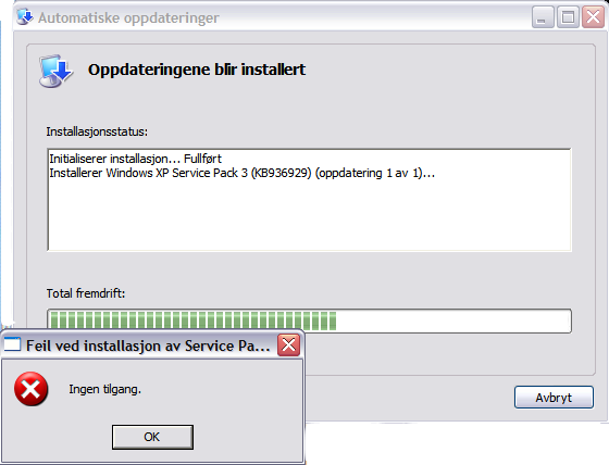 Salt kjeks Skrevet 12. mai 2008 Skrevet 12. mai 2008 Jeg så 0x80070005 loggen der: Failure Content Install Installation Failure: Windows failed to install the following update with error 0x80070005: Windows XP Service Pack 3 (KB936929). Søkte på dette på www.gewgle.com 0x80070005 - "access denied" to the registry keys involved in Windows Update Kan skyldes bla. antivirus. Kan være verdt å prøve uten. Jeg skal til helgen...