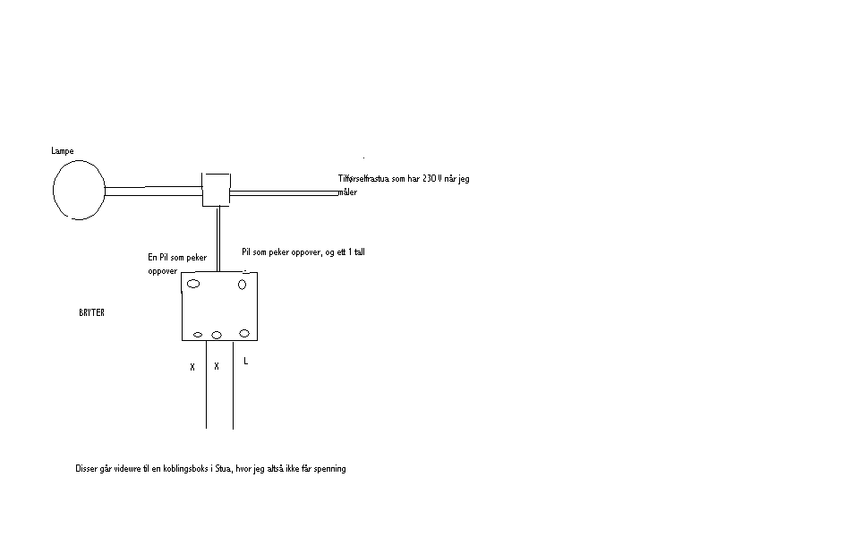 Joney Skrevet 27. mai 2008 Skrevet 27. mai 2008 (endret) Her har du et koblingskjema: (er det mulig lol. en åpenbar feil rettet.) Har ikke tatt hensyn til farger samt har gått utifra at du har brukt en enpolet bryter og at det er en 3leder (+jord) mellom koblingsboksen og bryteren. Valgte ikke El-energi på andreåret, så dette er kun basickunskaper fra VG1. Rett meg om jeg har feil. Anyways. som tidligere nevnt, og som ikke kan nevnes mange nok ganger. Dersom du ikke har peiling og begynner å tukkle med det elektriske anlegget er det veldig lett å gjøre feil. Dersom det oppstår en alvorlig jordfeil og du i tillegg kanskje har en jordfeil på vaskemarskinen, hårføneren, brødristern, osv. som ikke er oppdaget. Kan du ved direkte berøring i verstefall omkomme på stedet. Andre farer med dette er at du ved bruk av feil verktøy f. eks, kan skade isolasjonen nok til at det over tid oppstår varmeutvikkling. Feilaktig avisolering, dårlig kobling er bare to av mange ting du kan gjøre feil slik at det er fare for brann. Hvis du er på jobb, og huset ditt brenner ned pga dårlig arbeid utført av en ufaglært amatør uten fagbrev eller sikkerhetskurs, kan være nok til at huset ikke dekkes på forsikkring. Anbefaller at du får en elektrikker til å fikse det. Endret 27. mai 2008 av Joney