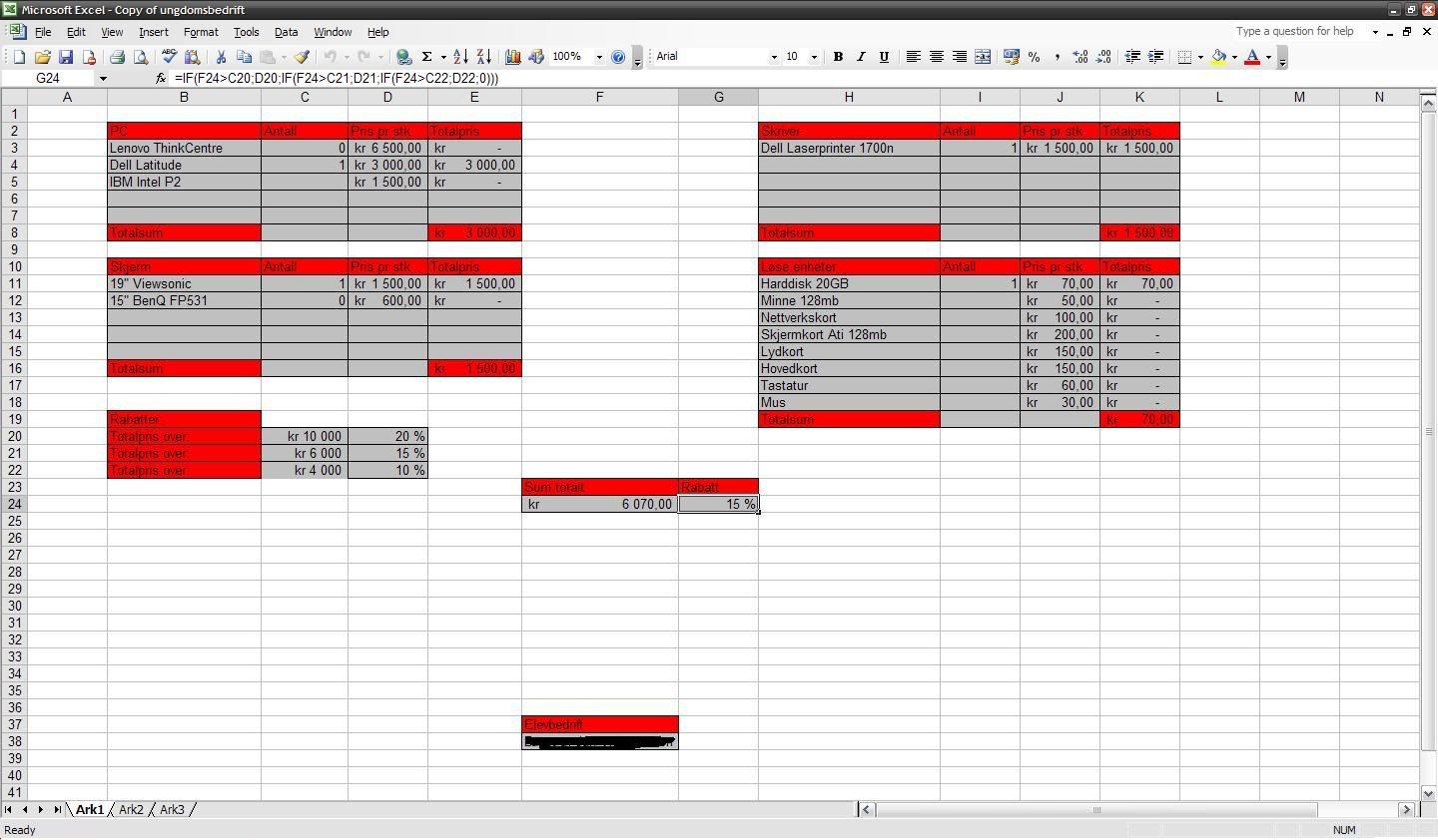 JayCamino Skrevet 6. juni 2008 Forfatter Skrevet 6. juni 2008 Som du ser, så er F24 summen fra de 4 andre rutene. (PC, Skjerm, Skriver, Løse enheter). Denne gjør vi ingenting med. G24 viser hvor mye rabatt kunden skal få hvis F24 blir over summene du ser til venstre. (C20-C22). Dette er greit Det jeg ikke får til, er at jeg skal ha en celle som regner ut summen, ETTER avdrag på prosent. Jeg hadde tenkt til å ha dette på F24, men så at lønte seg å ha egen celle. Så nå har jeg en egen celle som heter "Endelig Sum", og den skal da få summen inkludert rabatt. Så hvis du ser på screenshot, så skal endelig sum bli 5159,90,- men jeg får den ikke til å bli det. Vet ikke om du skjønte problemet mitt mer nå jeg. xD Slik ville jeg gjort: I celle G24 skriver du denne formelen: =HVIS(F24>C22;HVIS(F24>C21;HVIS(F24>C20;D20;D21);D22);0) I celle F26 Skriver du "Total rabbatert pris" og merker med rødt I celle F27 skriver du =F24*(1-G24) Var det slik du hadde tenkt? Ja! Nå redda du dagen min Tusen takk