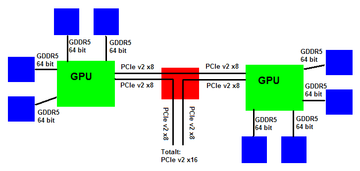 Simen1 Skrevet 9. juli 2008 Skrevet 9. juli 2008 (endret) Jeg ser for meg at brikken i midten fungerer som en svitsj for PCIe-signaler slik at man får utnyttet alle 16x (PCIe) fra hver GPU. Uten denne brikken ville det bare vært x8 kobling til hver GPU. Vel, det er i hvert fall sånn jeg forestiller meg det. Redigert: Den røde brikken i midten er merket PLX på bildet. PLX technologies produserer PCIe-svitsjer. Ut i fra størrelsen å bedømme (ca 27*27 mm) er det en PEX 8632 eller en PEX 8648. Jeg er ganske sikker på at det er sistnevnte på grunn av 48 PCIe lanes slik som jeg tegnet de. PEX8648 har et typisk effektforbruk på 4,0 watt. NB. Der jeg skriver GDDR5 64bit så er det egentlig 2 stk koherente GDDR5-kanaler på 32bit der hver av kanalene går til hver sin minnebrikke. En på forsiden og en på baksiden av kortet. Elektrisk/logisk sett er det 4 minnekanaler a 64bit på hver GPU. Hver enkelt minnebrikke har 32bit minnebuss. Grunnen til at den ene GPU-en er rotert 180 grader i forholdt til den andre er for å få PCIe-tilkoblingene mot hverandre slik at de slipper å krysse noen av minnebussene for å nå fram til PLX-brikken. Endret 9. juli 2008 av Simen1