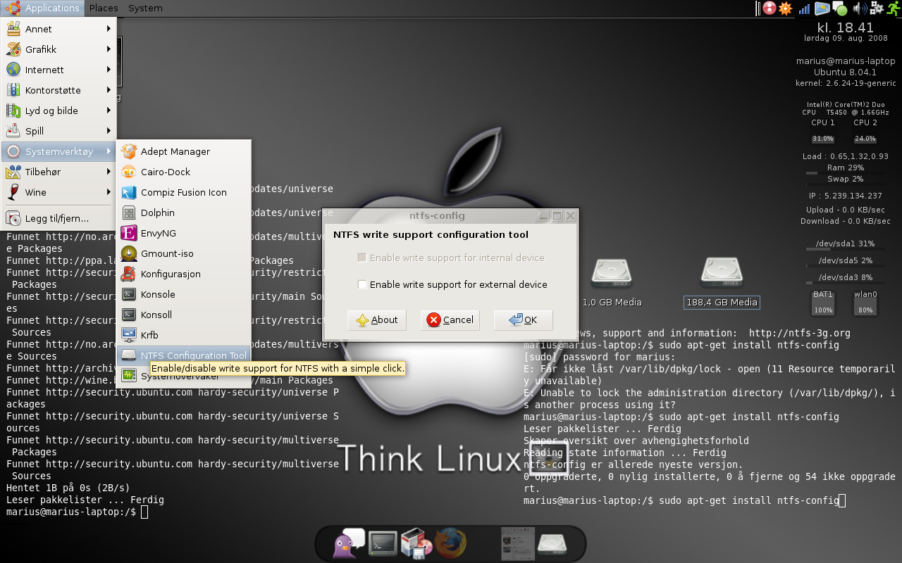 RattleBattle Skrevet 9. august 2008 Skrevet 9. august 2008 Installer heller ntfs-config. Hvis du ikke finner den under menyene etterpå, kjør programmet ved å trykke ALT + F2 og skriv gksu ntfs-config.