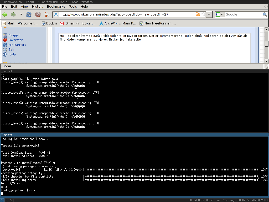DeadManWalking Skrevet 24. august 2008 Skrevet 24. august 2008 Hei, jeg sliter litt med øæå i kildekoden til et java program. Det er kommentarer til koden altså, redigerer jeg alt i vim går alt fint. Koden kompilerer og kjører. Bruker jeg f.eks scite ender jeg opp med dette i output fra javac; Hva kommer dette av? Bruker jeg eclipse eller gvim/Vim så fungerer det helt fint? Også en kildekodefil som compiler fint ser "altsÃ¥ en konstant" sånn ut i firefox. WTF? Den som ikke compiler skikkelig, og gir feilmelding som på bildet ser helt fint ut i firefox? rc.conf: LOCALE="nb_NO.UTF-8" HARDWARECLOCK="localtime" USEDIRECTISA="no" TIMEZONE="CET" KEYMAP="no-latin1" CONSOLEFONT=ter-112n.psf.gz CONSOLEMAP= USECOLOR="yes" KEYMAP_CHARSET="iso-8859-1" Jeg kan skrive øæå i urxvt.